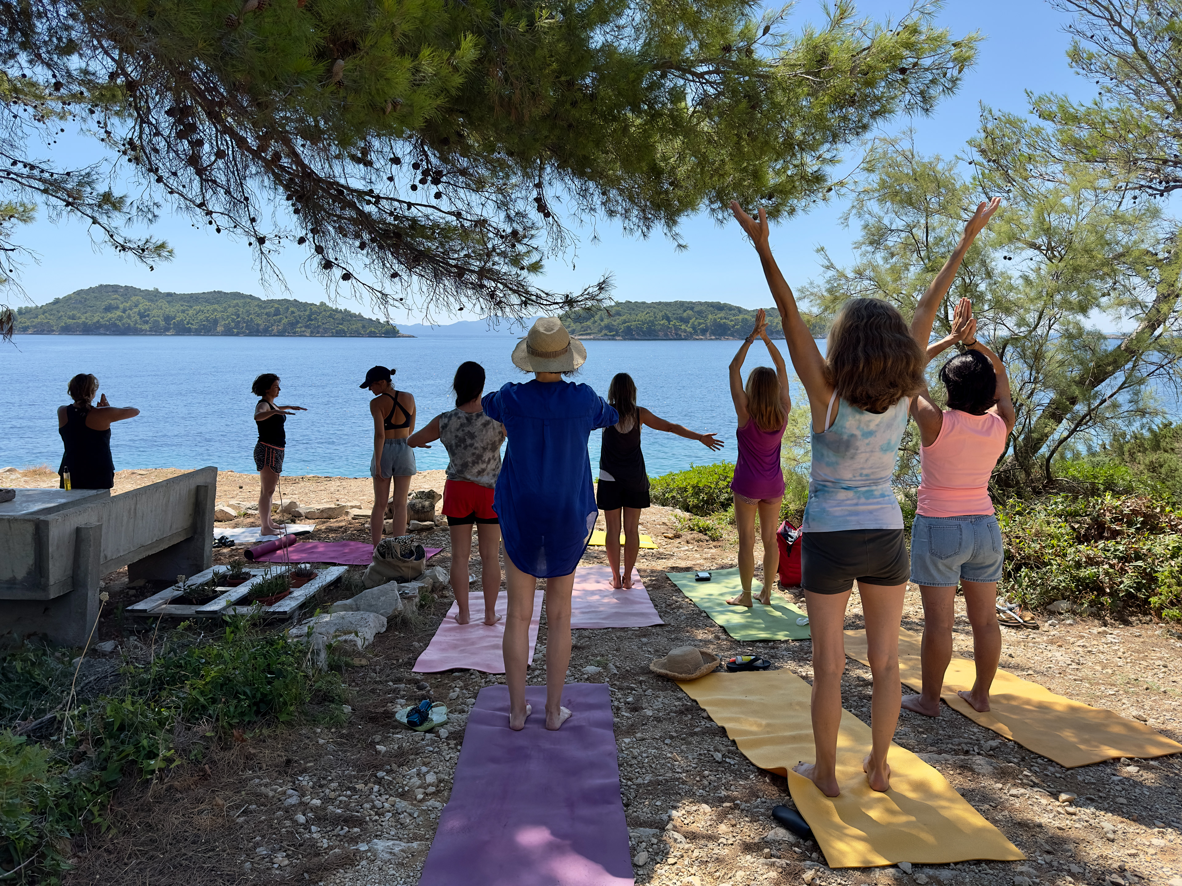 Pratique du Yoga et Aquayoga, Shiatsu et Do-In, pratique de l'ayuryoga Les pratiques auront lieu alternativement en extérieur sur les terrasses (avec vue sur la mer), dans la pinède et sur la plage. Environ 4h par jour